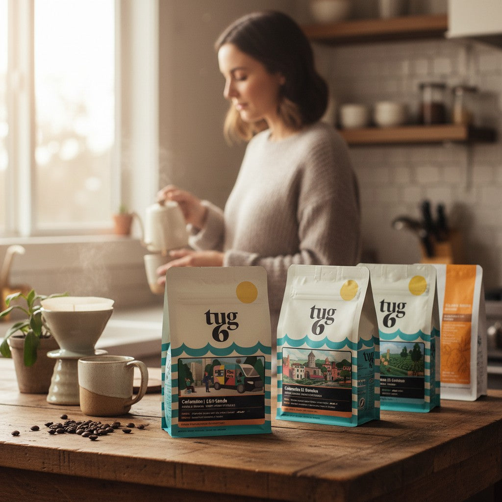 Tug 6 Colombia: A lightly-to-medium roasted single-origin coffee sourced from Cauca, Colombia. Grown at high altitudes (1,500–2,000 m) by CAFICAUCA, its cultivars include Red & Yellow Caturra, Colombia, and Castillo. Processed using a washed and sun-dried method, it delivers a creamy body and wonderful sweetness, with smooth milk-chocolate notes and a lingering finish that invites another sip.