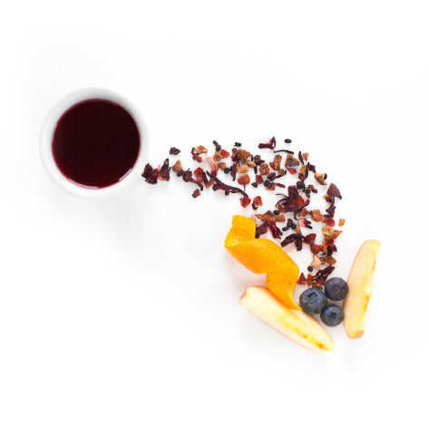 Apples, rosehips, hibiscus, citrus peels, pineapple bits, papaya, cornflower petals, and natural flavoring.